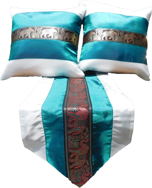 Housse de coussin et chemin de table SET 3 pièces bicolore éléphant bordure anniversaire mariage fête salon cuisine nappe hôtel Thai soie Thai Silk
